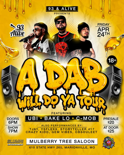 Join us Friday April 24th in Marionville MO atthe Legendary Mulberry Tree Saloon aka The Zombie Bar and Grill as Pumpkin Patch Ent and 93&Alive bring you A Dab Will Do Tour featuring UBI, BAKE LO, AND C-MOB. With some amazing local talent kicking the vibe off right. Come enjoy a stellar show and come hungry cause the venue has a horrifically pleasurable menue with food to die for.