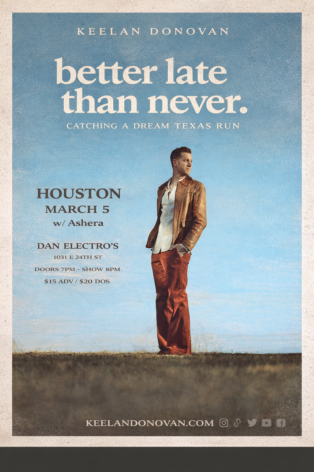 Keelan Donovan brings the Better Late Than Never. Texas run to Houston in support of his album Catching a Dream. Released last summer, this show marks the first intentional album release celebration, leading into a hometown Austin album release night. Honest songwriting, a full band, and a night built around songs that took their time to arrive.